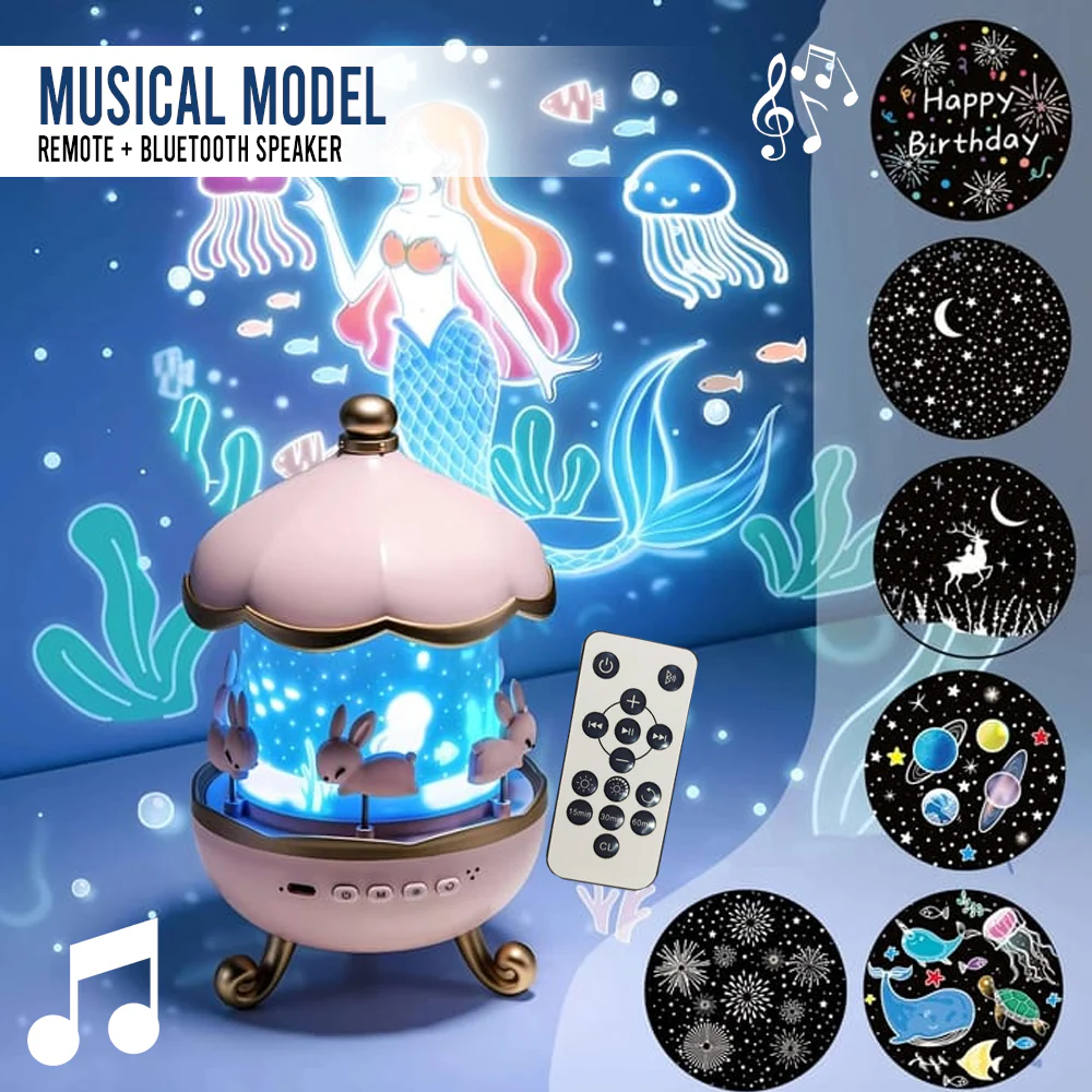 6 عروض خيالية في جهاز واحد: يتضمن 6 شرائح عرض مختلفة تشمل (الفضاء، عالم البحار، حورية البحر، عيد ميلاد سعيد، الغابة، والنجوم).